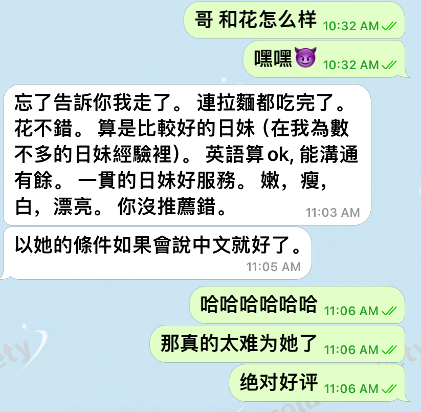 服务:吻kiss,全身漫游,共浴,裸吹,69,深喉,足交,乳交,水中萧,按摩,车震,口爆,黑丝诱惑,制服,激情爱爱,双飞(除日本之外),3+1